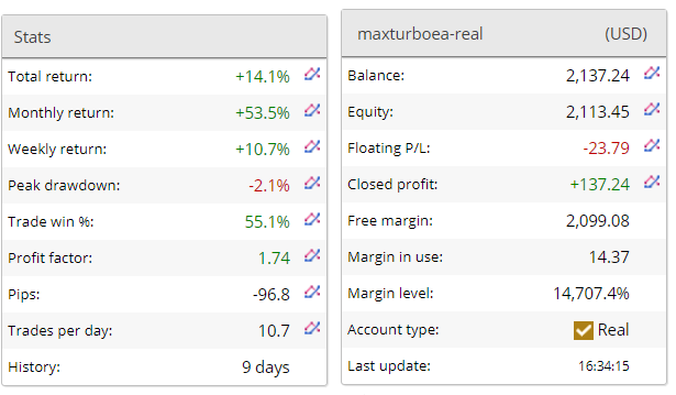 Maxturbo EA has been started very well and got 10.7% of weekly return with 1.74 profit factor.