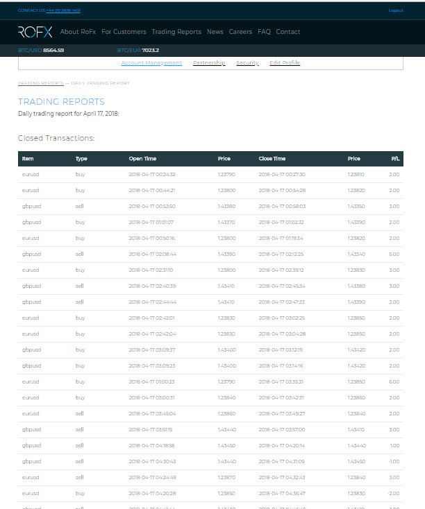 Trading reports reflect operations the robot carries out on each specific day, for instance, on April 17, the profit was 0.42% (if you are logged in you can follow the link https://my.rofx.net/private/trading-reports/2018/4/17) or go to https://rofx.net or https://www.myfxbook.com